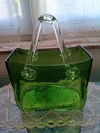 Di un bel colore verde, con manici trasparenti. Bello pesante e grande. Misura 24 cm. di altezza/ largo 19 cm / profondo 10 cm.