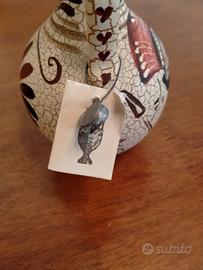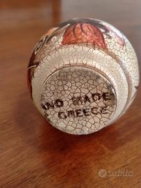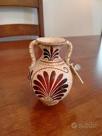 Splendida riproduzione di un’anticaanfora greca, realizzata interamente a mano secondo le tecniche tradizionali della ceramica artistica. L'oggetto è unacopia museale certificata(come indicato dal sigillo metallico e dal cartellino visibili in foto), creata per riprodurre fedelmente i reperti archeologici originali. Materiale:Pregiata creta (argilla) lavorata e dipinta a mano con finitura policroma. Decoro:Presenta l'effigie di un guerriero con elmo crestato, tipica dell'iconografia classica, arricchita da motivi floreali sul collo del vaso. Lavorazione:La superficie presenta un caratteristico effetto "invecchiato" con finitura craquelé, studiato per simulare il passaggio del tempo e l'usura dei reperti autentici. Dettagli:Dotata di due manici arcuati e una base stabile, perfetta come elemento d'arredo per collezionisti o amanti dell'arte classica, misura altezza: 11.5 cm
