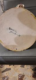Si tratta di una ceramica artigianale di Sciacca, una località siciliana famosissima per la sua tradizione ceramista. La firma "Percone" identifica l'autore o la bottega. Vaso artigianale in ceramica di Sciacca - Firmato Percone - Rose a rilievo Splendido vaso cilindrico in ceramica artistica di Sciacca, interamente realizzato e dipinto a mano. Il vaso presenta una raffinata decorazione floreale con rose e boccioli applicati a rilievo (stile "a tutto tondo") su una base di colore giallo solare con texture lavorata. Origine: Sciacca (Sicilia), rinomato centro di produzione ceramica. Firma: Presente sulla base (Percone Sciacca). Stile: Classico/Barocco siciliano. Pezzo unico ideale per arredamento classico o per collezionisti di ceramiche siciliane.