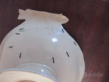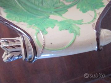 Elegantissimo centrotavola in terraglia di provenienza inglese con foglie di vite in rilievo. L'oggetto è risalente a circa il 1830 e come da foto è danneggiato e riparato con la tecnica dell'epoca, cosa che lo rende particolarmente ricercato dai collezionisti.