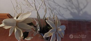 Vaso arredo con fiori colo burro e sul fondo sassolini color corallo e bianchi