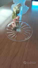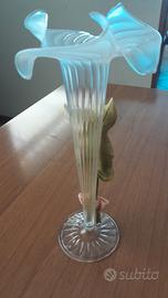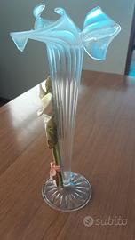 Vaso artistico in vetro monofiore " bud vase " a forma di calla impreziosito da un'applicazione in rilievo che raffigura una calla bianca con foglie verdi e fiocchetto rosa alla base. Prodotto lavorato a mano anni '60/ '70 . Altezza cm 22.