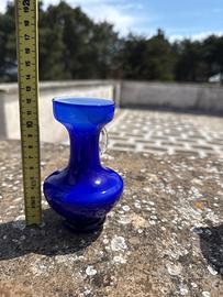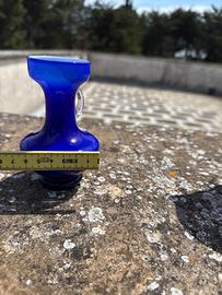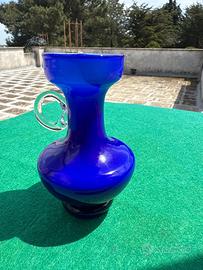 Colore: È di un blu molto scuro e intenso, quello che in arte si chiama "blu cobalto". Sembra quasi il colore del mare profondo. Materiale: È fatto di vetro soffiato. Lo si capisce dalla forma morbida e dal manico trasparente "appiccicato" a caldo, che crea un bel contrasto. Forma: È "cicciottello" in basso (la pancia) e ha un collo stretto che si allarga in alto. Sembra una piccola anfora antica rivisitata in chiave moderna. Manico: Ha un solo manico tondo e trasparente, molto particolare, che lo rende facile da impugnare e decorativo. Utilizzo: È perfetto per un singolo fiore a stelo lungo o anche solo da tenere su una mensola dove batte il sole, così il vetro blu si illumina.