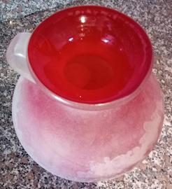 Vaso brocca lavorato in vetro Scavo di Murano , colore rosso/manico bianco , interno vaso lucido , manifattura Seguso '80, etichetta originale Seguso visibile vicino al fondo del vaso. misure vaso: peso kg.4,5 circa altezza cm.25 larghezza massima diametro cm.26 collo cm.9 bocca cm.14 fondo cm.12 misure manico: interno vetro Scavo, esterno lucido: altezza cm.7 larghezza cm.4 distanza manico dal collo( luce )cm.7 Pagamento, Paypal, bonifico, contanti.