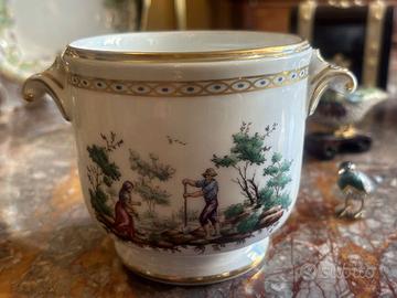 Piccolo vaso cachepot da collezione, in porcellana della Richard Ginori anni 50 linea “Pittoria”, raffigura una scena di vita rurale con figure di contadini, alberi e paesaggi campestri