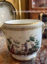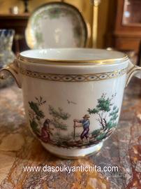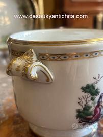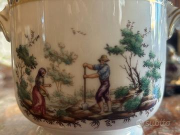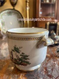 La porcellana è rifinita con dettagli dorati sul bordo superiore e sulla base, oltre a un motivo decorativo lungo il bordo superiore. Le due piccole anse laterali aggiungono un elemento funzionale ed estetico.
