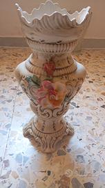Vendo magnifico vaso ornamentale d'epoca in porcellana di Capodimonte, un pezzo di grande presenza scenica grazie alla sua altezza di ben 45 cm (dimensioni generose, arriva all'altezza della seduta di una sedia standard). Il vaso è un esempio perfetto di artigianato artistico napoletano anni '70, caratterizzato da: Lavorazione a rilievo: Ricchi decori barocchi con volute e foglie d'acanto. Dettaglio floreale: Grande rosa applicata centralmente, modellata interamente a mano con petali sfumati. Finitura: Smaltatura color avorio con patinatura anticata che ne esalta i volumi e i dettagli. Dettagli Tecnici: Altezza: circa 45 cm. Marchio di autenticità: Presente sul fondo il marchio blu con la "N" coronata originale. Stato: Oggetto vintage in eccellenti condizioni di conservazione (fiori integri). Un complemento d'arredo perfetto per chi ama lo stile classico, il modernariato o per allestimenti in stile Shabby Chic e Barocco Ritiro a mano Fuorigrotta Napoli