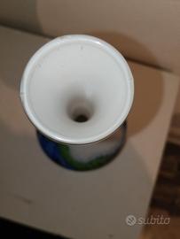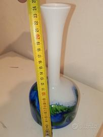 Splendido vaso in vetro di Murano alto circa 25 cm, firmato Carlo Muretti. Colori vivaci tra verde, blu e bianco, con un design elegante e raffinato tipico dell’arte muranese. Perfetto per valorizzare qualsiasi ambiente grazie alla sua forma slanciata e originale. Un pezzo unico per collezionisti o per chi cerca un tocco di classe e colore alla propria casa.