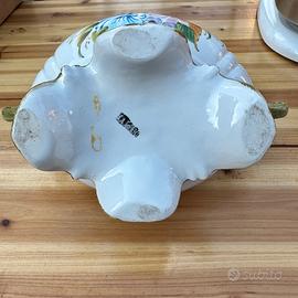VASO CENTRO TAVOLA CON DUE MANICI IN CERAMICA VERNICIATA NELLA PARTE ANTERIORE CON DEI FIORI NESSUNO SBECCO O ROTTURA MISURE LARCO 26 cm ALTO 20 cm.