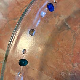 Elegante vaso centrotavola in vetro martellato, impreziosito da pietre colorate lungo il bordo. Un pezzo unico che aggiunge un tocco di vivacità e raffinatezza alla tua tavola. - Design unico con pietre incastonate. - Finitura martellata che cattura la luce. - Perfetto come centrotavola o portafrutta. Piatto centrotavola Berendsohn vetro e argento 925 Elegante piatto/centrotavola Berendsohn Exclusive Art Collection in vetro spesso martellato con inserti decorativi colorati lungo il bordo e applicazioni in **argento** 925‰, produzione italiana con certificato originale Berendsohn Italiana SpA. Diametro circa 35 cm, concavo SpediIone Protetta immediata