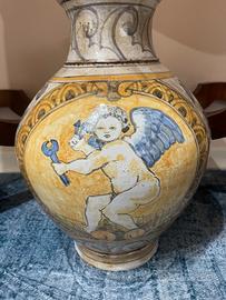 Bellissimo vaso ceramica antica raffigurante putto che tiene in mano gli oggetti della passione di Cristo.