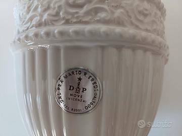 Questo vaso in ceramica bianca è ispirato alle anfore neoclassiche dell'antica Grecia e Roma, prodotto probabilmente tra gli anni '50 e '70 del XX secolo. La manifattura D&P (visibile nel marchio) era nota per la produzione di ceramiche decorative di alta qualità in stile neoclassico.
