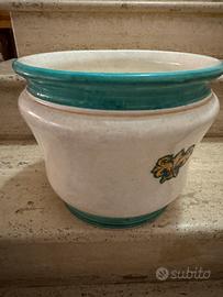 Il portavaso presenta un decoro vivace e dettagliato che include una luna crescente con volto, circondata da stelle, su uno sfondo blu scuro. Questo motivo è incorniciato da elaborati disegni ornamentali in verde e oro, che richiamano lo stile barocco o ornato tipico di molte ceramiche di Castelli. Fattura eccellente