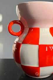 La sua forma richiama le anfore tradizionali, ma il design è tutto fuorché convenzionale. I doppi manici rotondi e il bordo rosa aggiungono un tocco giocoso e moderno, mentre il pattern geometrico a scacchi arancio e bianco cattura immediatamente l'attenzione. È l'accessorio ideale per chi ama osare con le scelte d'arredo e desidera portare allegria e carattere negli spazi domestici.