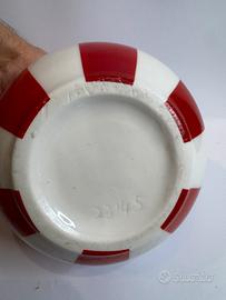 Splendido vaso vintage in ceramica italiana, databile tra la fine degli anni '60 e l'inizio dei '70. Design "Pop Art" caratterizzato da audaci bande verticali rosse e bianche e un particolare manico ad anello (ring handle), tipico della manifattura di Montelupo Fiorentino in particolare dei fratelli Fanciullacci