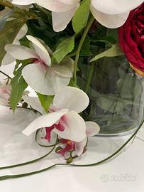 Vaso cilindrico grande in vetro trasparente molto elegante e scenografico. Composizione interna di foglie, orchidee e fiori rossi dal forte impatto visivo. Ritiro: 00077 Laghetto di Monte Compatri (Roma)