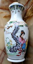La base bianca come la neve, sottile e delicata, con una lucentezza morbida, quasi lattiginosa, è la più rara ed esteticamente preziosa del suo genere. La superficie è delicatamente dipinta a mano con motivi tradizionali e caratteri cinesi, applicati sul corpo trasparente e leggero del vaso. Una poetica narrazione pittorica si dispiega su tutta la superficie del vaso: aggraziate donne cinesi in abiti tradizionali, gesti pacati e silhouette fluide. Sono circondate da rami fioriti, motivi vegetali ed elementi architettonici, come frammenti di un antico giardino o di un cortile di palazzo. Ogni lato del vaso è come una cornice separata: nella parte anteriore, figure immerse in una conversazione silenziosa o in contemplazione; Sul retro, la continuazione del paesaggio crea un senso di movimento e profondità. Il collo è decorato con una sottile fascia ornamentale, delicata, quasi un gioiello, che completa la composizione e conferisce al vaso un tocco raffinato.