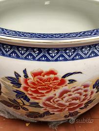 Vaso cinese Cachepot in porcellana con caratteristico decoro floreale policromo e filetti in oro zecchino , questo portavaso cinese originariamente veniva usato come vasca per carpe e pesci rossi, auspicio di salute e longevità. porcellana smaltata e invetriata.