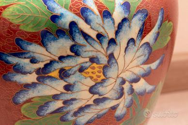 Elegante vaso cinese realizzato con la tradizionale tecnica Cloisonné, risalente alla seconda metà del '900. Un oggetto decorativo di grande raffinatezza, perfetto per collezionisti o per dare un tocco esotico all'arredamento.