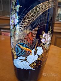 Vaso cinese originale porcellana KUTANI finemente decorato su fondo blu. Stile vintage ottimo per fiori. Anche spedizione con imballo di protezione accurata.