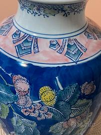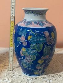 Vaso in porcellana vintage in stile Chinoiserie. Presenta un ricco motivo floreale e di frutti, nei toni del rosa, verde e giallo, che risaltano su un fondo blu cobalto intenso.