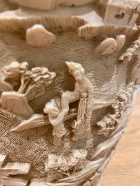 Vendo bellissimo vaso in finto avorio, ossia resina tutto finemente intagliato con manici a testa d’elefante e e paesaggi intagliati ricchi di particolari e un intaglio molto fine e raffinato, come si vede dalle foto annesse