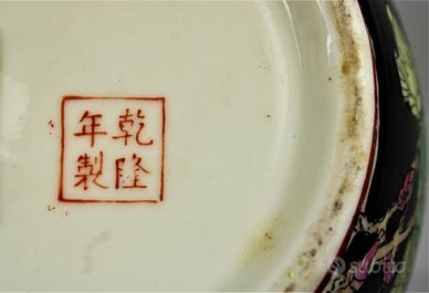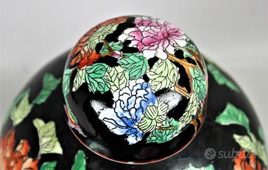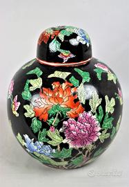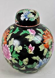 Originale vaso Cinese a forma globulare con coperchio amovibile, in ceramica dipinta a mano con smalti policromi su fondo nero.