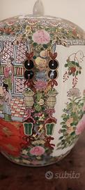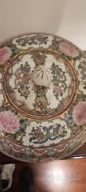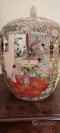 Grande vaso cinese con coperchio decorato con scene floreali e di vita comune. Ho inserito un anno di produzione tra il 1920/1930 perché era nella soffitta di una mia zia, ma non posso garantire che quella sia la sua effettiva età, può darsi sia più antico o più moderno Il vaso l'ho lasciato deliberatamente da pulire proprio per farlo vedere cosi come l'ho trovato. Ha un marchio sotto la base per me indecifrabile Purtroppo non posso aggiungere altro data la miascarsa conoscenza dell'arte cinese. Le sue dimensioni sono di cm.39 di altezza massima e cm.29 di diametro massimo In caso di vendita verrà spedito tramite Poste Italiane con tutte le precauzioni. Le spese di spedizione saranno un po' più alte data la cura della imballo