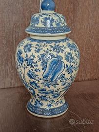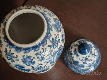 Vaso cinese antico con dipinti fiori e foglie in colore blu incluso coperchio. 38 altezza, 20 larghezza, 11 diametro apertura. 18esimo secolo