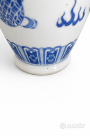 Elegante vaso in porcellana cinese blu e bianco, realizzato secondo i canoni decorativi della tradizione classica riconducibile alla dinastia Qing. Il corpo presenta una raffinata decorazione sottosmalto in blu cobalto raffigurante creature mitologiche stilizzate e motivi ornamentali simbolici, elementi ricorrenti nella produzione cinese di gusto imperiale. Il collo è impreziosito da una fascia geometrica continua, mentre il piede si presenta ben proporzionato e rifinito.