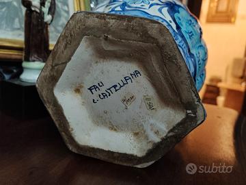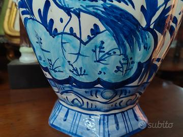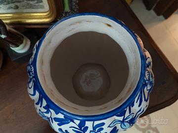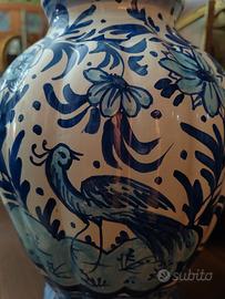 Grande Vaso in stile storicistico, tutto dipinto a mano con bellissimi fiori e un bellissimo pavone in blu cobalto realizzata presso la FACI di Civita Castellana nei primi decenni del XX secolo. Ottime condizioni, con il marchio sotto