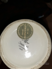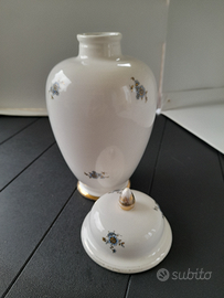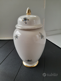 Vendo vaso in ceramica bianca anni 50 ,con coperchio, decorato con motivi floreali e scena in oro. Altezza circa 22cm e larghezza massima circa 12