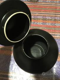 Vaso Vintage, fabbricato in Italia ma con disegni etnici. Il vaso è in prevalenza color nero di ceramica smaltata. I disegni sono color oro, rosso, bianco e blu. Il vaso comprensivo di coperchio è alto 26 cm, senza coperchio misura 18 cm di altezza e la larghezza massima è di 19 cm. Sul coperchio c'è una piccola sbeccatura (vedi ultime foto) ma non si nota; il prezzo tiene conto anche di questo. Possibilità di usarlo anche come portafiori senza coperchio; il vaso è in ottimo stato! Possibilità di consegna a mano zona centro Milano oppure sera o weekend in piazzale Martini, zona sud di Milano.