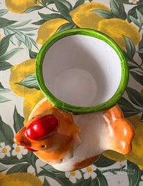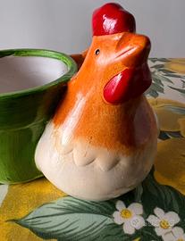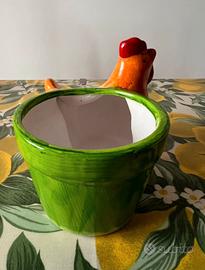 Vaso decorativo in ceramica con gallina. Sì può inserire al suo interno una pianta vera o finta, cioccolatini, uovo di Pasqua o altro. Fantastico come regalo pasquale.