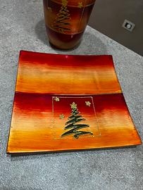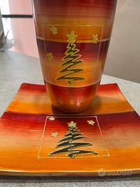 Elegante vaso con piattino quadrato coordinato, realizzati in ceramica dipinta a mano e decorati con un albero di Natale in glitter dorato. Il set presenta sfumature calde che vanno dal rosso all’arancione, perfette per creare un’atmosfera festiva in casa. Entrambi i pezzi sono in perfette condizioni e risultano ideali come centrotavola, come complemento d’arredo natalizio o come idea regalo raffinata. Misure piattino: 22x22cm