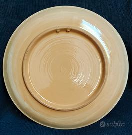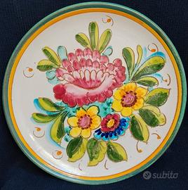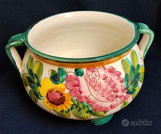 Vendo vaso con piatto abbinato, in ceramica decorata, lavorazione artigianale. Il piatto può essere appeso a un muro. Dimensioni vaso: larghezza bocca cm. 17; circonferenza parte larga cm. 65, altezza cm. 12,5. Diametro del piatto cm. 29.