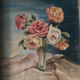 Vaso con rose. Anni 40/50. Olio su tela in cornice