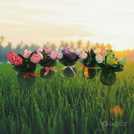 Interamente realizzato a mano in stoffa. Il vaso è in vetro. Il prezzo è riferito per ognuno.