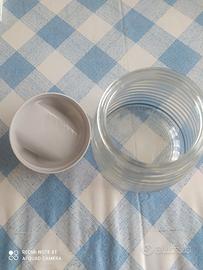Vaso contenitore in vetro con coperchio in plastica nuovo, mai usato, il vaso ha un'ottima chiusura tanto che si può prendere dal coperchio.