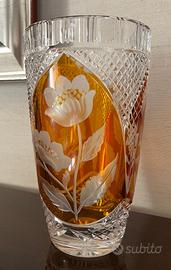 Elegante vaso vintage in pregiato cristallo di Boemia color ambra, caratterizzato da una raffinata lavorazione artigianale. Il corpo del vaso presenta tre medaglioni con decori floreali incisi e satinati a mano, incorniciati da una complessa molatura a punte di diamante che garantisce una brillantezza straordinaria.
