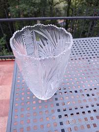 Vaso per fiori vintage in cristallo trasparente massiccio e pesante con incisioni trasversali.