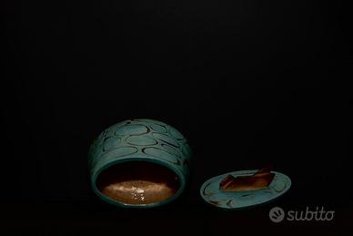 Lavorazione a fasce con terra bianca vicentina semirefrattaria, ingobbio petrolio fissato con staccatura a mano e decorato con affumicatura condotta. Rivisitazione in chiave moderna di un vaso officinale.