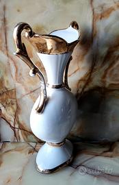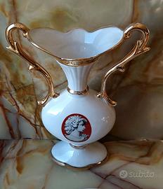 Vaso antico da collezione in porcellana Impero, stile neobarocco, neorococò, Italia In vendita un antico vaso in porcellana in stile Impero, decorato con manici dorati a sbalzo e un elegante profilo femminile al centro. Questo elegante vaso, probabilmente realizzato in Italia tra la fine del XIX e la metà del XX secolo (circa 1950-1970), è realizzato in uno stile raffinato, ispirato allo splendore barocco e alla raffinatezza dell'epoca rococò. La forma e gli elementi decorativi come le linee ornate, i riccioli, la doratura e la forma raffinata e i manici dorati ci indicano che appartiene allo stile neobarocco o neorococò. L'immagine centrale è un profilo femminile su sfondo rosso, che ricorda i cammei antichi. Potrebbe essere una rappresentazione allegorica di una musa o di una dea classica. Tali elementi vennero utilizzati attivamente a metà del XX secolo, soprattutto in Italia, Francia e Germania. Il marchio sul fondo del recipiente è difficile da distinguere, ma probabilmente si tratta del sigillo di una delle vecchie manifatture italiane (acquistato in Italia). Il timbro sul fondo, che inizia con "La", indica l'origine italiana e la lavorazione artigianale sottolinea l'unicità del prodotto. Timbri simili vennero utilizzati nelle fabbriche italiane di Limoges e Capodimonte all'inizio del XX secolo. Eventuali leggere abrasioni sulla doratura non costituiscono un difetto, ma al contrario una vera e propria prova del tempo, che non fa che accentuare il fascino vintage dell'oggetto. Queste graziose tracce del tempo testimoniano la sua autenticità e trasformano il vaso in un oggetto decorativo davvero suggestivo. Il contenitore può essere utilizzato come vaso decorativo, ma anche per conservare fiori secchi o incenso. Grazie alla sua forma raffinata e alla sua decorazione, diventerà un elemento raffinato dell'arredamento in stile classico o vintage. È perfetto per interni in stile Impero, Barocco, Rococò, Shabby Chic o classico, aggiungendo raffinatezza e un tocco sto