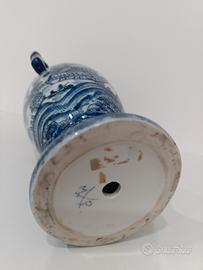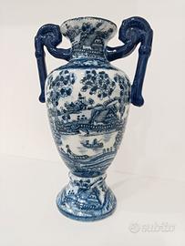 Vaso da design a forma di anfora con manici, con dipinto un motivo paesaggistico in stileblue and white. La decorazione che ricorda lo stile orientale.I manici sono di un blu e presentano una forma stilizzata che evoca figure di animali o forme organiche. Uno dei due manici presenta evidente usura. SPESE DI SPEDIZIONE ESCLUSE DAL Prezzo.