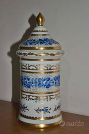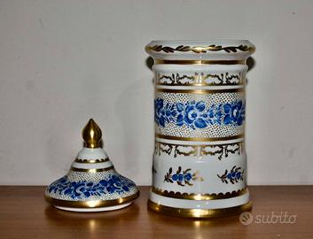 Elegante vaso da farmacia in porcellana, impreziosito da finiture in oro e decorazioni floreali blu.