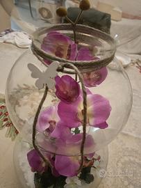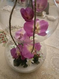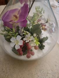 All'interno presenta una composizione di fiori di stoffa tra cui spicca un delicato ramo di orchidee.