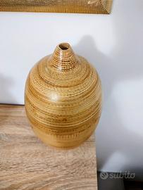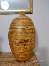 Vaso decorativo dalla forma organica e affusolata. Realizzato con una lavorazione a listelli naturali (effetto stratificato) che esalta le venature e le calde sfumature del bambù. Design minimal, stile Zen, Japandi, nordico. Perfetto come pezzo unico per un arredamento minimalista, boho o scandinavo. In perfette condizioni. Altezza 30cm. Imballaggio accurato.