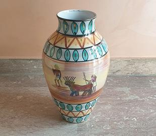 Vaso decorativo in ceramica con decorazioni geometriche e figure stilizzate che richiamano lo stile egizio