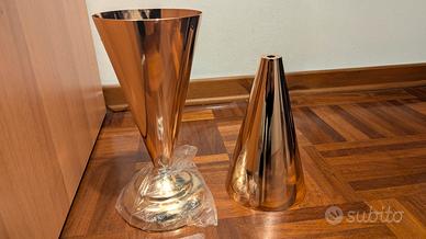 L’oggetto è realizzato in metallo leggero con una raffinata finitura color oro metallico lucido, ideale per arredare Bellissimo vaso decorativo da tavolo dal design moderno e minimale, caratterizzato da un'elegante forma a cono rovesciato.