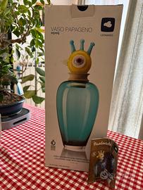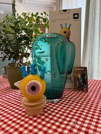 Splendido vaso di design della collezione Papageno di Leonardo, modello Peppe. Un pezzo d'arte contemporanea caratterizzato da un corpo in vetro turchese dalle linee pulite e un tappo decorativo scultoreo a forma di occhio/creatura, realizzato a mano.